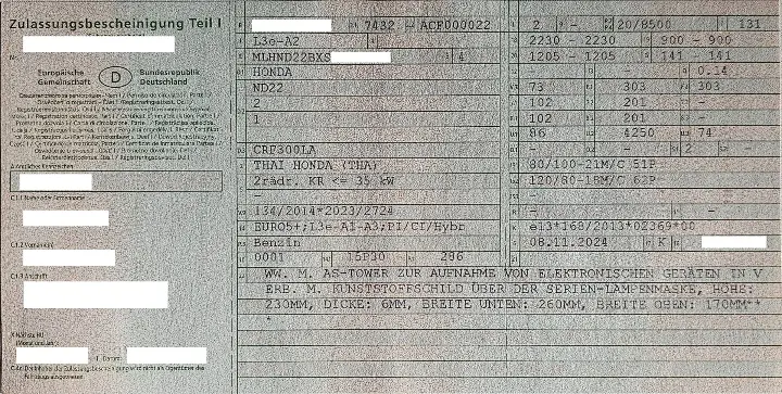 Now that this has been done once, if German customers want to get their bike individually approved with a COLOURED mini fairing screen, then they can send the vehicle registration document Peter passed over (below) to the TÜV and have an entry made there according to §19.2 in conjunction with §21.