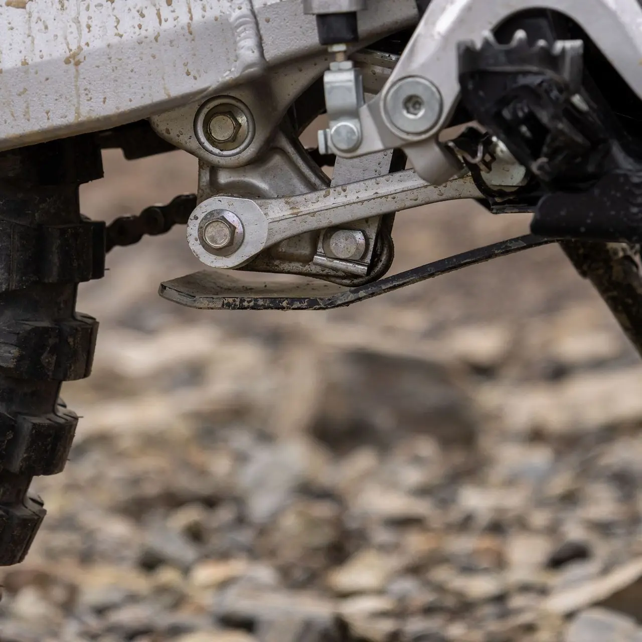 Over-length HDPE slider extends to cover and protect rear suspension linkage.